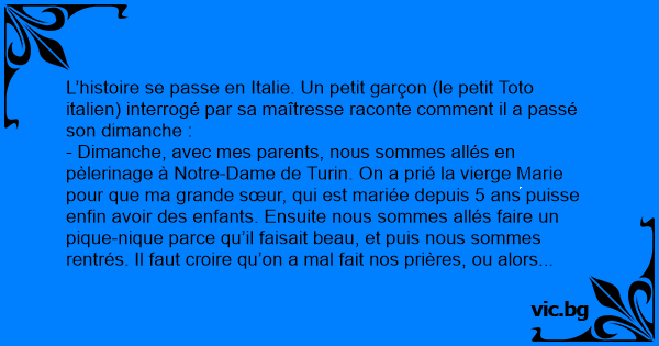 - Dimanche, avec mes parents, nous sommes allés en pèlerinage à Notre-Dame de Turin. On a prié la vierge Marie pour que ma grande sœur, qui est mariée depuis 5 ans puisse enfin avoir des enfants. Ensuite nous sommes allés faire un pique-nique parce qu’il faisait beau, et puis nous sommes rentrés. Il faut croire qu’on a mal fait nos prières, ou alors qu’on ne s’est pas bien compris avec la madone… Toujours est-il que quand nous sommes rentrés à la maison, ma plus jeune sœur nous annonçait qu’elle était enceinte alors qu’elle n’est même pas mariée !