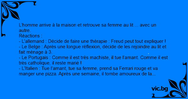- Le Portugais : Comme il est très machiste, il tue l’amant. Comme il est très catholique, il reste marié !
