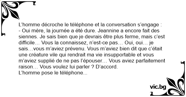 - Oui mère, la journée a été dure. Jeannine a encore fait des siennes. Je sais bien que je devrais être plus ferme, mais c’est difficile… Vous la connaissez, n’est-ce pas… Oui, oui… je sais…vous m’aviez prévenu. Vous m’aviez bien dit que c’était une créature vile qui rendrait ma vie insupportable et vous m’aviez supplié de ne pas l’épouser… Vous aviez parfaitement raison… Vous voulez lui parler ? D’accord.