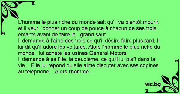 Il demande à l'aîné des trois ce qu'il désire faire plus таrd. Il lui dit qu'il adore les voitures. Alors l'homme le plus riche du monde lui achète les usines General Motors.