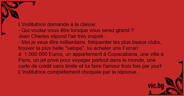 L'institutrice complètement choquée par la réponse vulgaire et crue de Jean Charles , essaie de récupérer la situation et feignant de l'ignorer et demande: