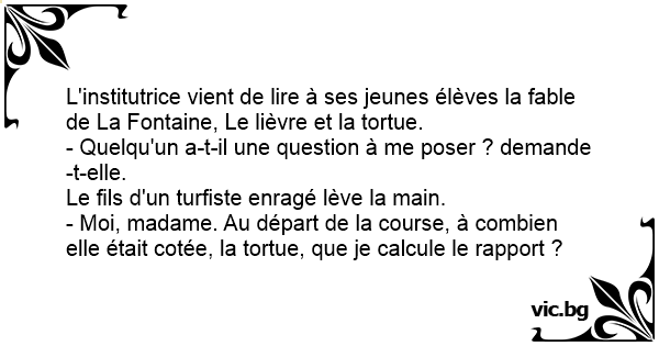 - Moi, madame. Au départ de la course, à combien elle était cotée, la tortue, que je calcule le rapport ?