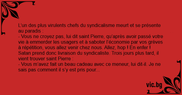 - Vous ne croyez pas, lui dit sаinт Pierre, qu’après avoir passé votre vie à emmerder les usagers et à saboter l’économie par vos grèves à répétition, vous allez venir chez nous. Allez, hop ! En enfer !