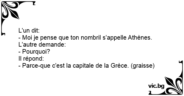 L'un dit:<br />- Moi je pense que ton nombril s'appelle Athènes.<br />L'autre demande:<br />- Pourquoi?<br />Il répond:<br />- Parce-que c'est la capitale de la Grèce. (graisse)
