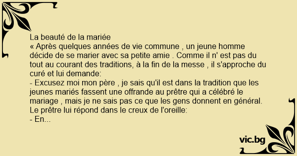 « Après quelques années de vie commune , un jeune homme décide de se marier avec sa petite amie . Comme il n' est pas du tout au courant des traditions, à la fin de la messe , il s'approche du curé et lui demande: