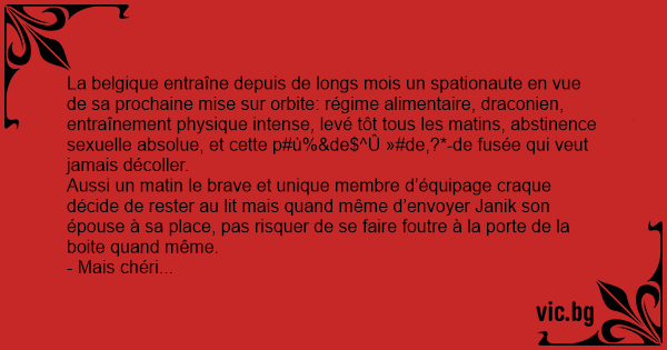La belgique entraîne depuis de longs mois un spationaute en vue de sa prochaine mise sur orbite: régime alimentaire, draconien, entraînement physique intense, levé tôt tous les matins, abstinence sexuelle absolue, et cette p#ù%&de$^Û »#de,?*-de fusée qui veut jamais décoller.