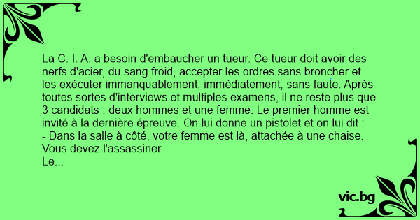 La C. I. A. a besoin d'embaucher un tueur. Ce tueur doit avoir des nerfs d'acier, du sang froid, accepter les ordres sans broncher et les exécuter immanquablement, immédiatement, sans faute. Après toutes sortes d'interviews et multiples examens, il ne reste plus que 3 candidats : deux hommes et une femme. Le premier homme est invité à la dernière épreuve. On lui donne un pistolet et on lui dit :