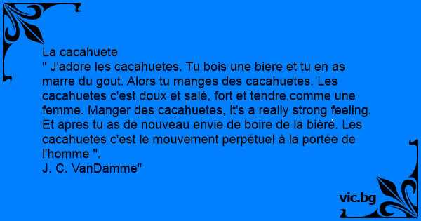 " J'adore les cacahuetes. Tu bois une biere et tu en as marre du gout. Alors tu manges des cacahuetes. Les cacahuetes c'est doux et salé, fort et tendre,comme une femme. Manger des cacahuetes, it's a really strong feeling. Et apres tu as de nouveau envie de boire de la bière. Les cacahuetes c'est le mouvement perpétuel à la portée de l'homme ".
