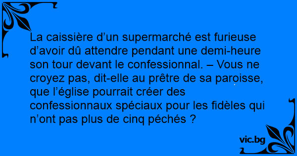 La caissière d’un supermarché est furieuse d’avoir dû attendre pendant une demi-heure son tour devant le confessionnal. – Vous ne croyez pas, dit-elle au prêtre de sa paroisse, que l’église pourrait créer des confessionnaux spéciaux pour les fidèles qui n’ont pas plus de cinq péchés ?