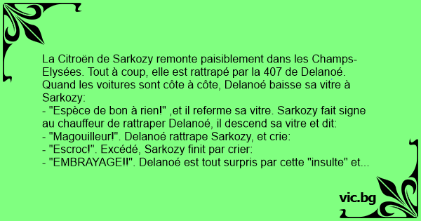 - "Espèce de bon à rien!" ,et il referme sa vitre. Sarkozy fait signe au chauffeur de rattraper Delanoé, il descend sa vitre et dit: