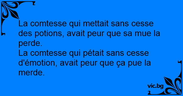 La comtesse qui mettait sans cesse des potions, avait peur que sa mue la perde.<br />La comtesse qui pétait sans cesse d'émotion, avait peur que ça pue la меrdе.
