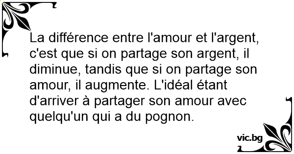 La différence entre l'amour et l'argent, c'est que si on partage son argent, il diminue, tandis que si on partage son amour, il augmente. L'idéal étant d'arriver à partager son amour avec quelqu'un qui a du pognon.