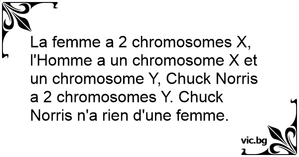 La femme a 2 chromosomes X, l'Homme a un chromosome X et un chromosome Y, Chuck Norris a 2 chromosomes Y. Chuck Norris n'a rien d'une femme.