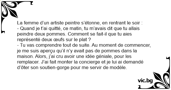 - Tu vas comprendre tout de suite. Au moment de commencer, je me suis aperçu qu’il n’y avait pas de pommes dans la maison. Alors, j’ai cru avoir une idée géniale, pour les remplacer. J’ai fait monter la concierge et je lui ai demandé d’ôter son soutien-gorge pour me servir de modèle.
