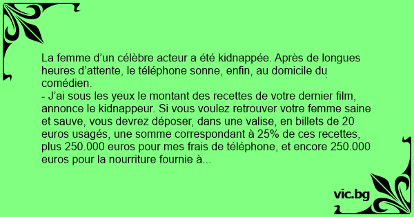 - J’ai sous les yeux le montant des recettes de votre dernier film, annonce le kidnappeur. Si vous voulez retrouver votre femme saine et sauve, vous devrez déposer, dans une valise, en billets de 20 euros usagés, une somme correspondant à 25% de ces recettes, plus 250.000 euros pour mes frais de téléphone, et encore 250.000 euros pour la nourriture fournie à votre épouse…
