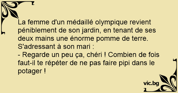 La femme d'un médaillé olympique revient péniblement de son jardin, en tenant de ses deux mains une énorme pomme de terre. S'adressant à son mari :