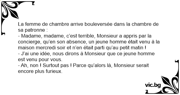 - Madame, madame, c’est terrible, Monsieur a appris par la concierge, qu’en son absence, un jeune homme était venu à la maison mercredi soir et n’en était parti qu’au petit matin !