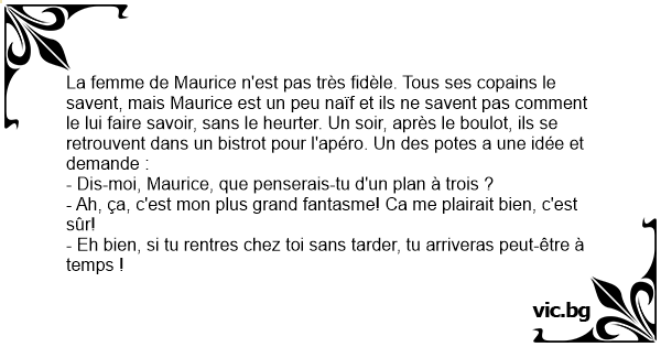 La femme de Maurice n'est pas très fidèle. Tous ses copains le savent, mais Maurice est un peu naïf et ils ne savent pas comment le lui faire savoir, sans le heurter. Un soir, après le boulot, ils se retrouvent dans un bistrot pour l'apéro. Un des potes a une idée et demande :