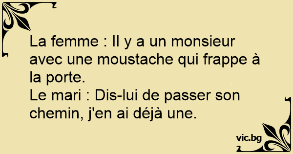 La femme : Il y a un monsieur avec une moustache qui frappe à la porte.