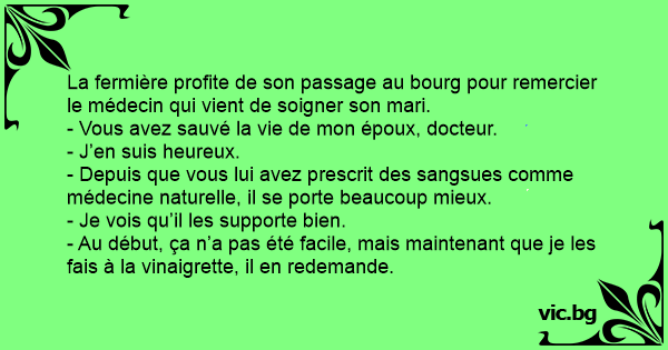 - Depuis que vous lui avez prescrit des sangsues comme médecine naturelle, il se porte beaucoup mieux.