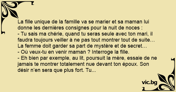 La fille unique de la famille va se marier et sa maman lui donne les dernières consignes pour la nuit de noces :