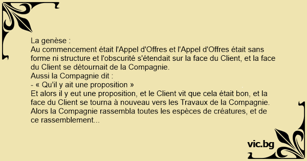 Et il advint que la pensée du Chef de Projet fut troublée par l'Appel d'offres et il crut alors que toutes choses étaient possibles, bien qu'il n'existât point, alors, de spécifications.