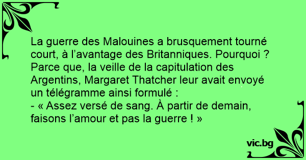 La guerre des Malouines a brusquement tourné court, à l’avantage des Britanniques. Pourquoi ? Parce que, la veille de la capitulation des Argentins, Margaret Thatcher leur avait envoyé un télégramme ainsi formulé :