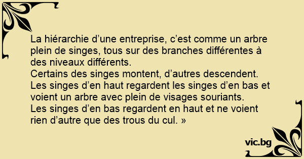 La hiérarchie d’une entreprise, c’est comme un arbre plein de singes, tous sur des branches différentes à des niveaux différents.