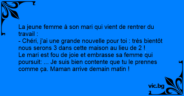 Le mari est fou de joie et embrasse sa femme qui poursuit: ... Je suis bien contente que tu le prennes comme ça. Maman arrive demain matin !