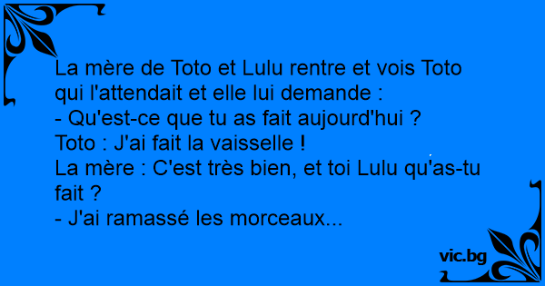La mère de Toto et Lulu rentre et vois Toto qui l'attendait et elle lui demande :