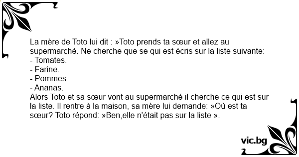 Alors Toto et sa sœur vont au supermarché il cherche ce qui est sur la liste. Il rentre à la maison, sa mère lui demande: »Où est ta sœur? Toto répond: »Ben,elle n'était pas sur la liste ».