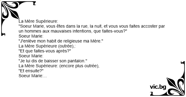 Abbedissan: - Syster Maria, om du gick genom staden sent en natt och du stötte på en man med dåliga avsikter, vad skulle du då göra? - Jag skulle lyfta på kjolen. Abbedissan chockad: ...
