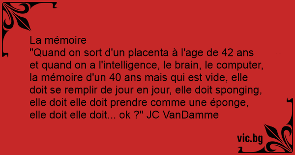 "Quand on sort d'un placenta à l'age de 42 ans et quand on a l'intelligence, le brain, le computer, la mémoire d'un 40 ans mais qui est vide, elle doit se remplir de jour en jour, elle doit sponging, elle doit elle doit prendre comme une éponge, elle doit elle doit... ok ?" JC VanDamme