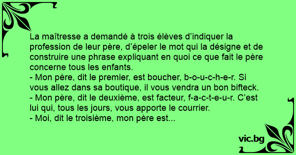 - Mon père, dit le premier, est boucher, b-o-u-c-h-e-r. Si vous allez dans sa boutique, il vous vendra un bon bifteck.