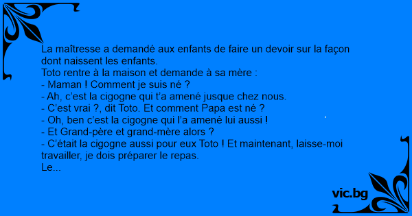 - C’était la cigogne aussi pour eux Toto ! Et maintenant, laisse-moi travailler, je dois préparer le repas.