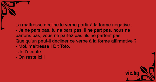 - Je ne pars pas, tu ne pars pas, il ne part pas, nous ne partons pas, vous ne partez pas, ils ne partent pas. Quelqu'un peut-il décliner ce verbe à la forme affirmative ?