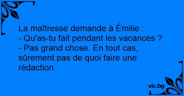 La maîtresse demande à Émilie : - Qu'as-tu fait pendant les vacances ? - Pas grand chose. En tout cas, sûrement pas de quoi faire une rédaction.