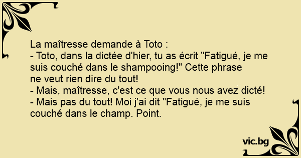 - Toto, dans la dictée d'hier, tu as écrit "Fatigué, je me suis couché dans le shampooing!" Cette phrase ne veut rien dire du tout!