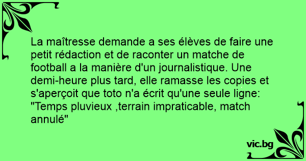 La maîtresse demande a ses élèves de faire une petit rédaction et de raconter un matche de football a la manière d'un journalistique. Une demi-heure plus таrd, elle ramasse les copies et s'aperçoit que toto n'a écrit qu'une seule ligne: "Temps pluvieux ,terrain impraticable, match annulé"