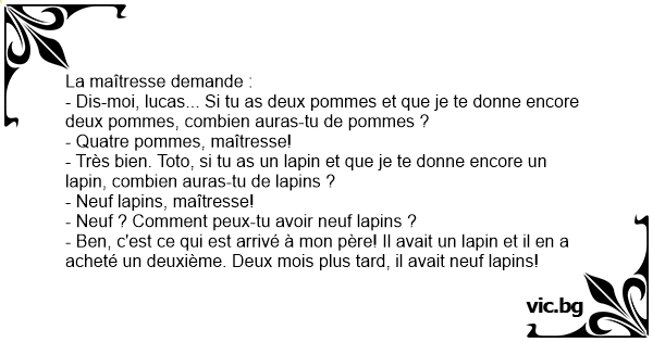- Ben, c'est ce qui est arrivé à mon père! Il avait un lapin et il en a acheté un deuxième. Deux mois plus таrd, il avait neuf lapins!