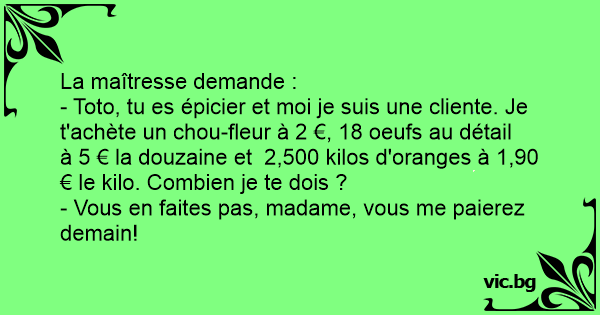 - Toto, tu es épicier et moi je suis une cliente. Je t'achète un chou-fleur à 2 €, 18 oeufs au détail à 5 € la douzaine et 2,500 kilos d'oranges à 1,90 € le kilo. Combien je te dois ?