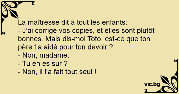 - J’ai corrigé vos copies, et elles sont plutôt bonnes. Mais dis-moi Toto, est-ce que ton père t’a aidé pour ton devoir ?