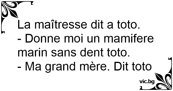 - Иванчо, кажи ми един беззъб бозайник La maestra dice: "Pierino mi sapresti dire il nome di un Mammifero senza denti?" Quels sont les mammifères qui n'ont pas de dents ? Teacher: "Who can tell what is a mammal? Little Johnny: "My grand mother!" A l’école, L’institutrice interroge Toto... - Toto, cite-moi un mammifère qui n’a pas de dents. - Toto répond : Ma grand-mère ! Il maestro dice a Pierino: "esistono mammiferi senza denti?" e Pierino risponde: "si, mi nonna". La maîtresse demande à toto: Peux-tu me citer un mammifère qui n'a pas de dents ? Euh....Ma mamie? La maestra sta facendo lezione di scienze. Mentre sta spiegando i mammiferi fa delle domande agli studenti: “Pierino, sapresti farmi un esempio di un mammifero senza denti?”. “Si’… mia nonna!” En clase, la profesora le pregunta a una alumna: -¿ Podrías decirme el nombre de un mamífero que no tenga dientes? - Sí: Tula. -¿ Tula? -¡ Sí, es mi abuelita! Ptá se učitelka Pepíčka: „Jaký jediný savec nemá zuby?” A Pepíček odpoví: „Můj děda.” Profesoara: - Bulisor, da-mi un exemplu de mamifer fara Dinti. Bula: - Desigur, bunica-mea.