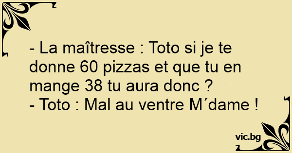 - La maîtresse : Toto si je te donne 60 pizzas et que tu en mange 38 tu aura donc ?