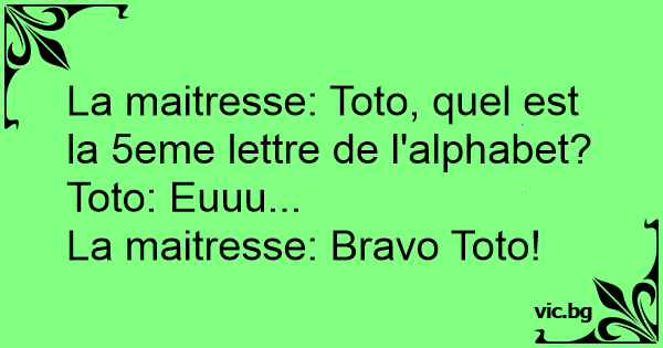 La maitresse: Toto, quel est la 5eme lettre de l'alphabet?