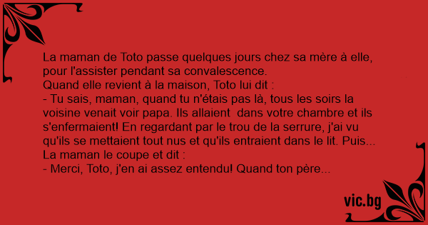 - Tu sais, maman, quand tu n'étais pas là, tous les soirs la voisine venait voir papa. Ils allaient dans votre chambre et ils s'enfermaient! En regardant par le trou de la serrure, j'ai vu qu'ils se mettaient tout nus et qu'ils entraient dans le lit. Puis...