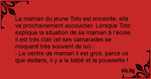 La maman du jeune Toto est enceinte, elle va prochainement accoucher. Lorsque Toto explique la situation de sa maman à l’école, il est très clair (et ses camarades se moquent très souvent de lui) :