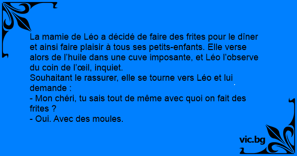 La mamie de Léo a décidé de faire des frites pour le dîner et ainsi faire plaisir à tous ses petits-enfants. Elle verse alors de l’huile dans une cuve imposante, et Léo l’observe du coin de l’œil, inquiet.
