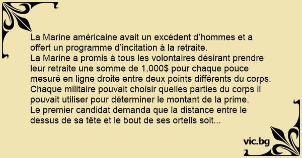 La Marine a promis à tous les volontaires désirant prendre leur retraite une somme de 1,000$ pour chaque pouce mesuré en ligne droite entre deux points différents du corps.
