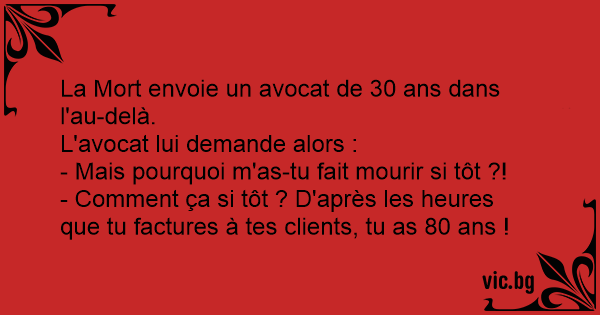 Egy ügyvéd meghal, és Szent Péter elé kerül. Kérdezi tőle: - Uram, miért kellett nekem ilyen fiatalon meghalnom? - Fiatalon? - csodálkozik Szent Péter - Hiszen az ügyfeleidnek felszámolt munkaórák...
